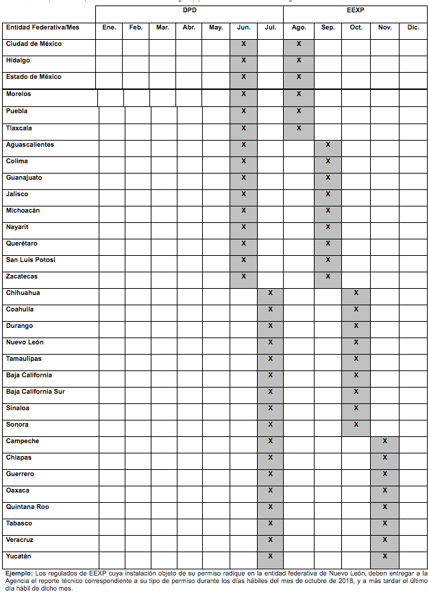 Dicho reporte debe presentarse en oficialía de partes de la Agencia en formato PDF con firmas autógrafas del regulado o representante legal y de la UV o representante legal de la UV que elaboró, entregándose durante el transcurso del mes que corresponda a su tipo de permiso y a más tardar el último día hábil de dicho mes, por medio de un escrito libre debidamente firmado, en el que se indique el contenido del medio digital(1), de conformidad con los siguientes calendarios: